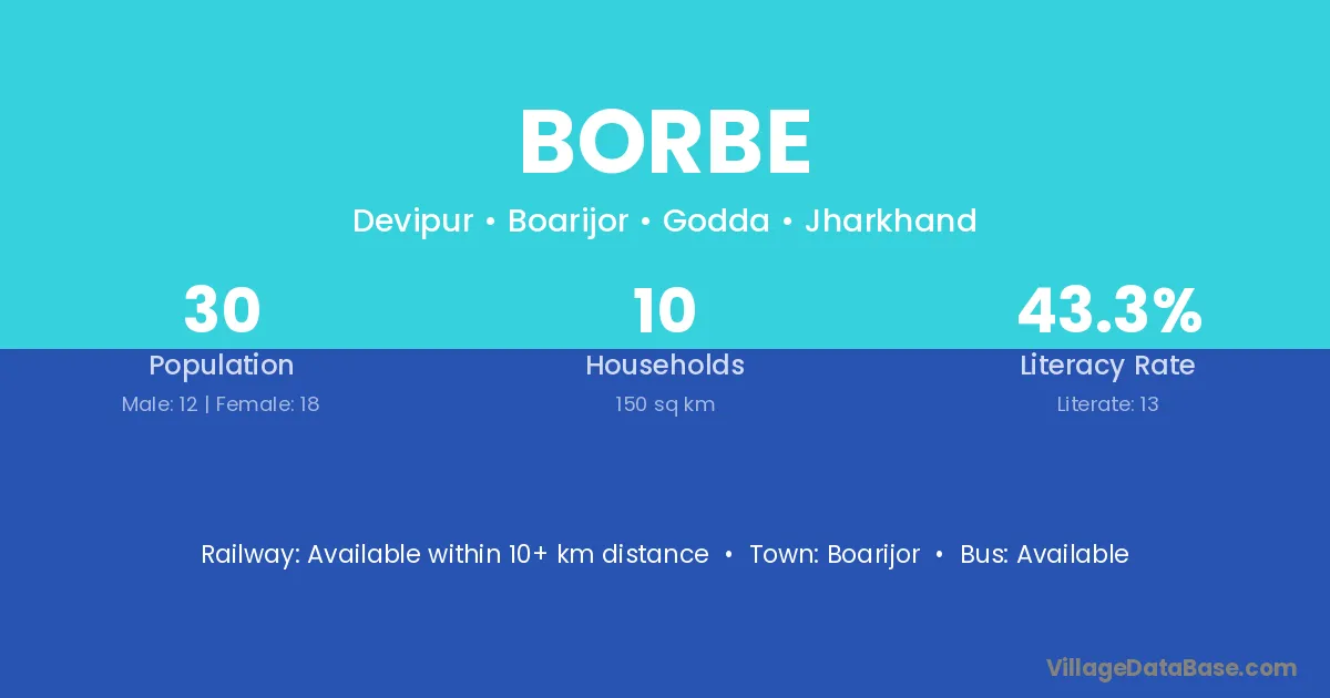 Borbe village has a total population of 30 people, of which 12 are males and 18 are females.