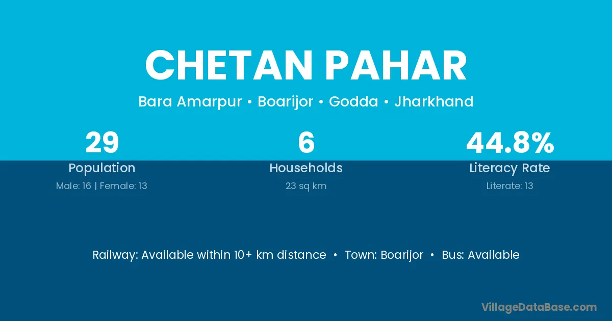 Chetan Pahar village has a total population of 29 people, of which 16 are males and 13 are females.