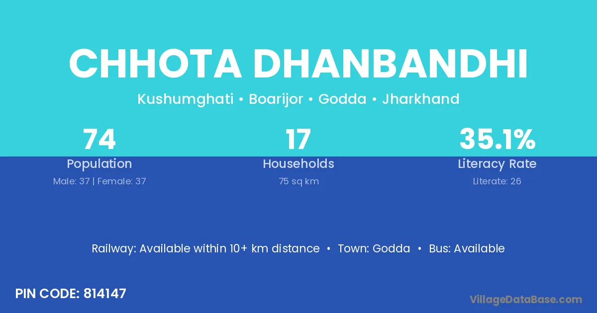 Chhota Dhanbandhi village has a total population of 74 people, of which 37 are males and 37 are females.