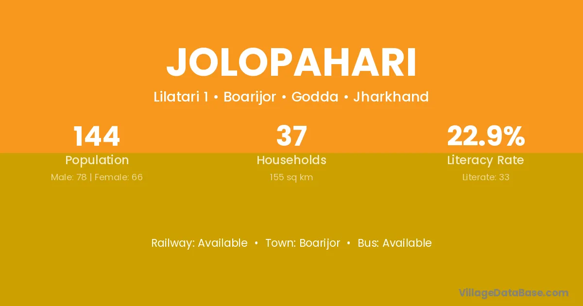 Jolopahari village has a total population of 144 people, of which 78 are males and 66 are females.