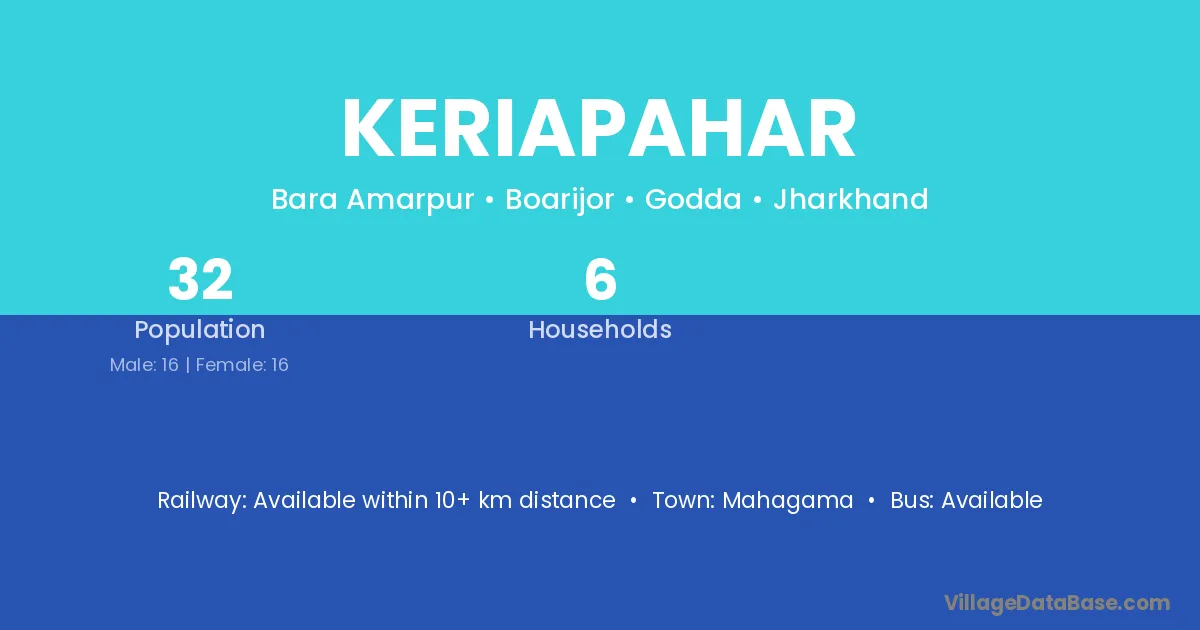 Keriapahar village has a total population of 32 people, of which 16 are males and 16 are females.