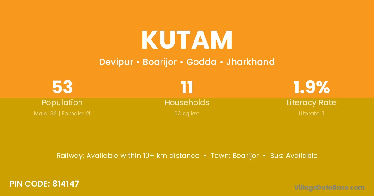 Kutam village has a total population of 53 people, of which 32 are males and 21 are females.