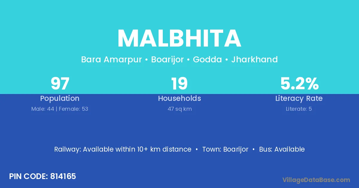The literacy rate of Malbhita village is 5.15%. Male literacy stands at 6.82% and female literacy at 3.77%.