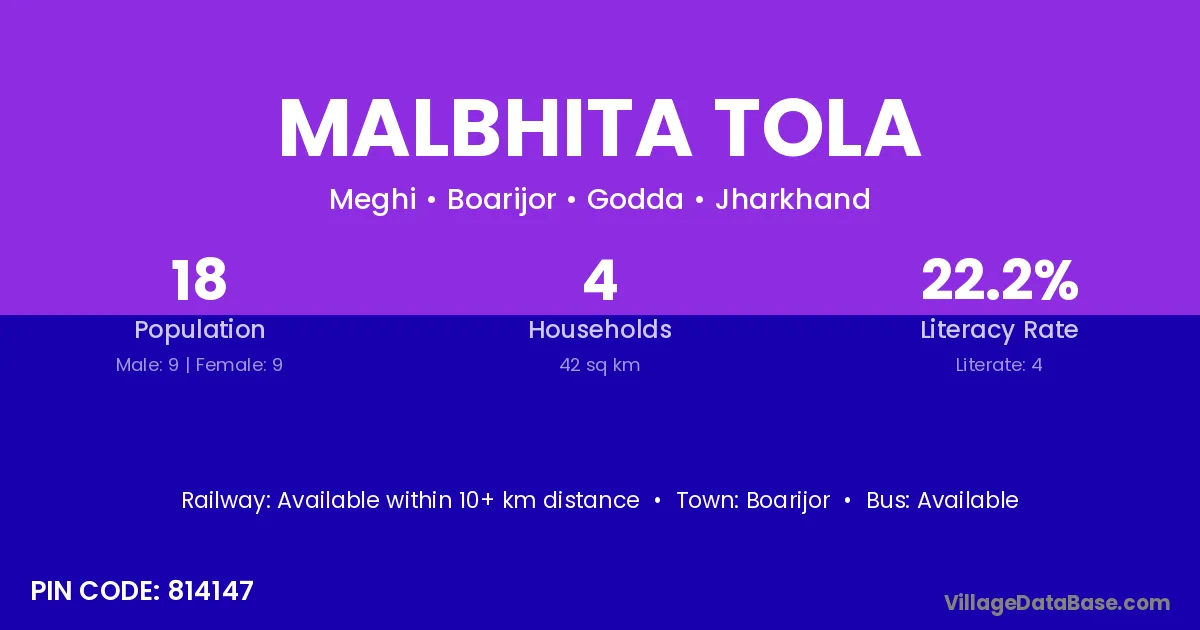Malbhita Tola village has a total population of 18 people, of which 9 are males and 9 are females.