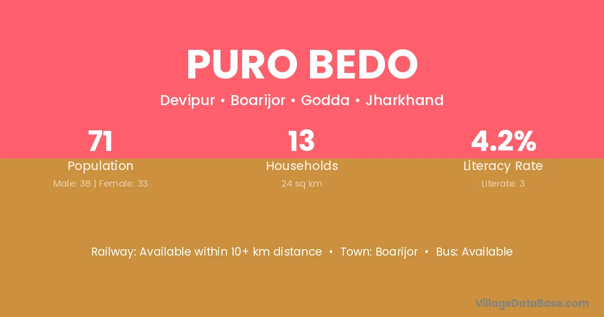 The literacy rate of Puro Bedo village is 4.23%. Male literacy stands at 7.89% and female literacy at 0.00%.