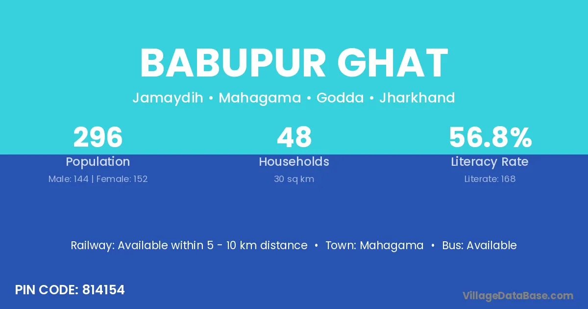 Babupur Ghat village has a total population of 296 people, of which 144 are males and 152 are females.