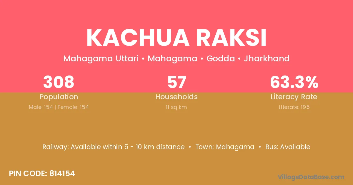 Kachua Raksi village has a total population of 308 people, of which 154 are males and 154 are females.