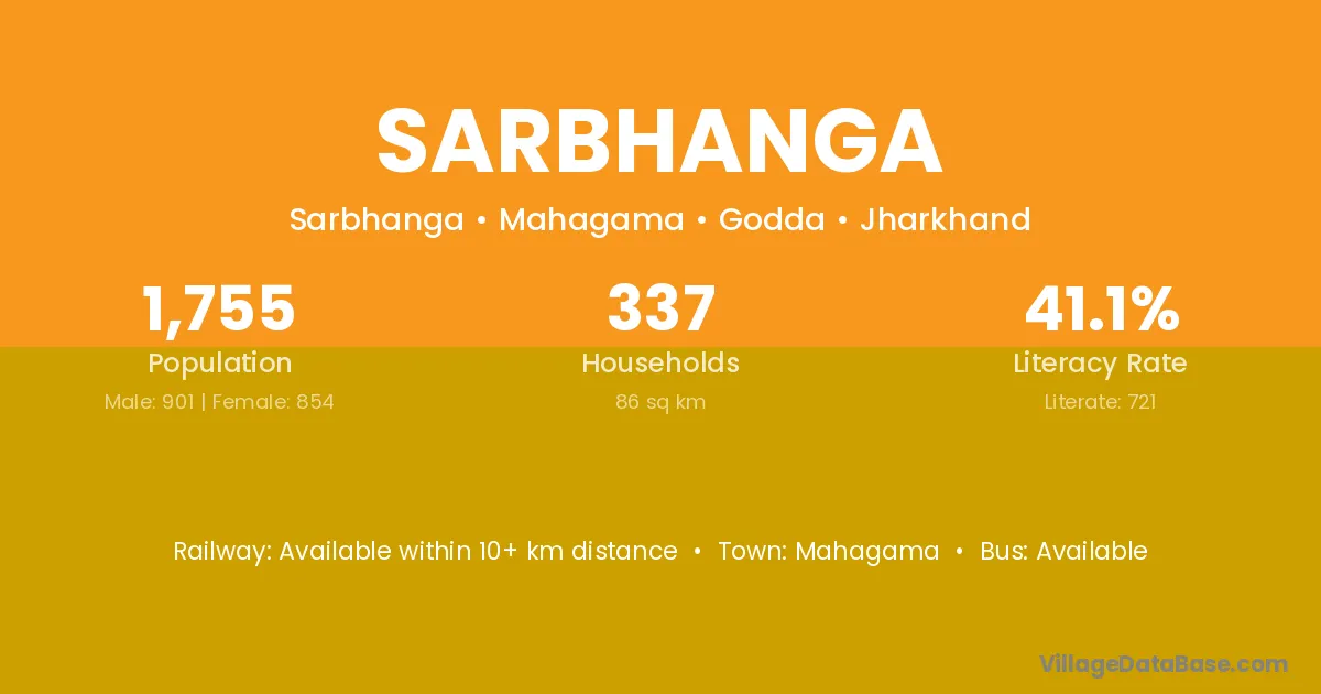 Sarbhanga village has a total population of 1,755 people, of which 901 are males and 854 are females.