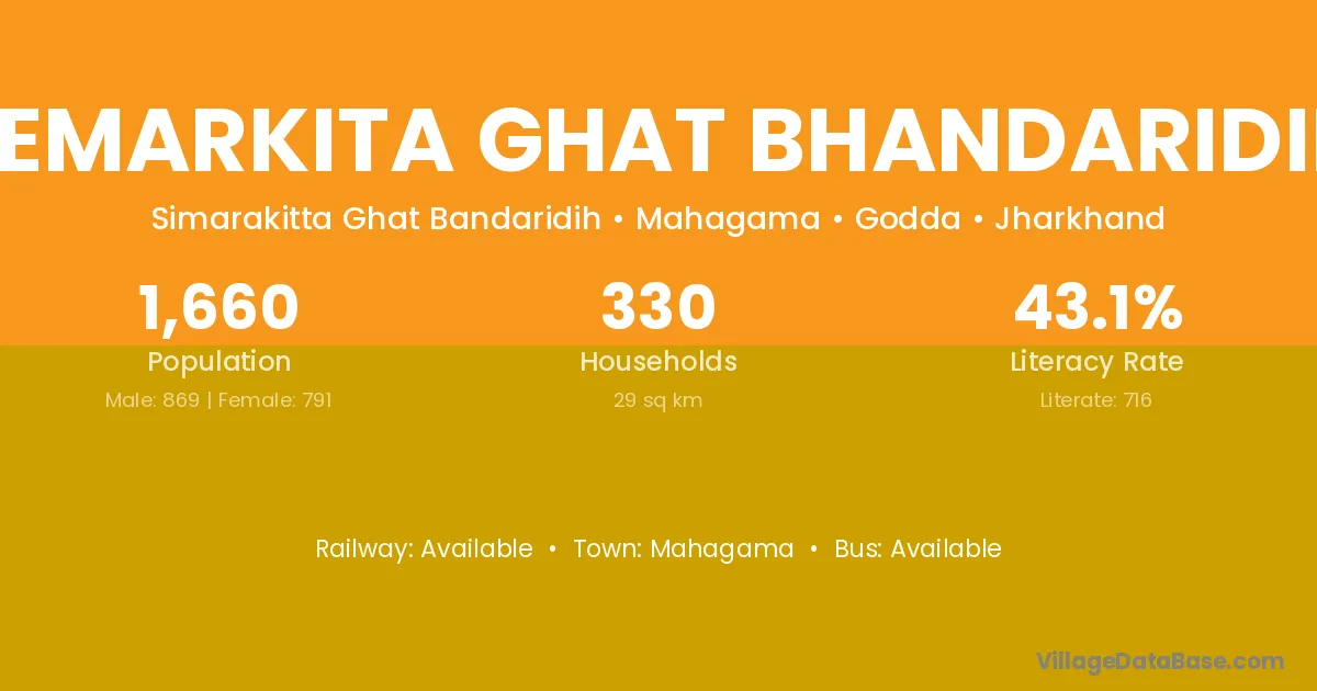 Semarkita Ghat Bhandaridih village has a total population of 1,660 people, of which 869 are males and 791 are females.