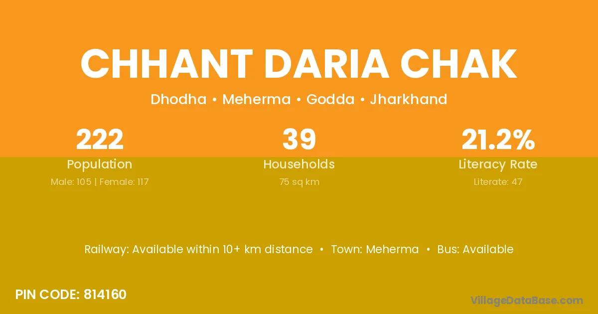 Chhant Daria Chak village has a total population of 222 people, of which 105 are males and 117 are females.