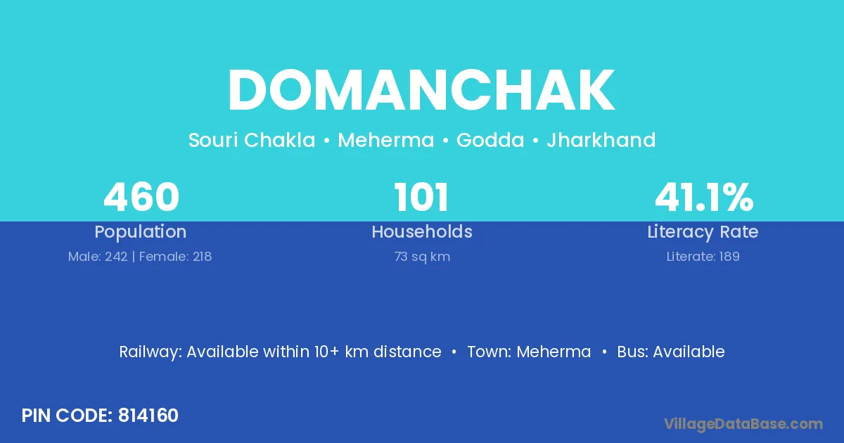 The literacy rate of Domanchak village is 41.09%. Male literacy stands at 54.96% and female literacy at 25.69%.