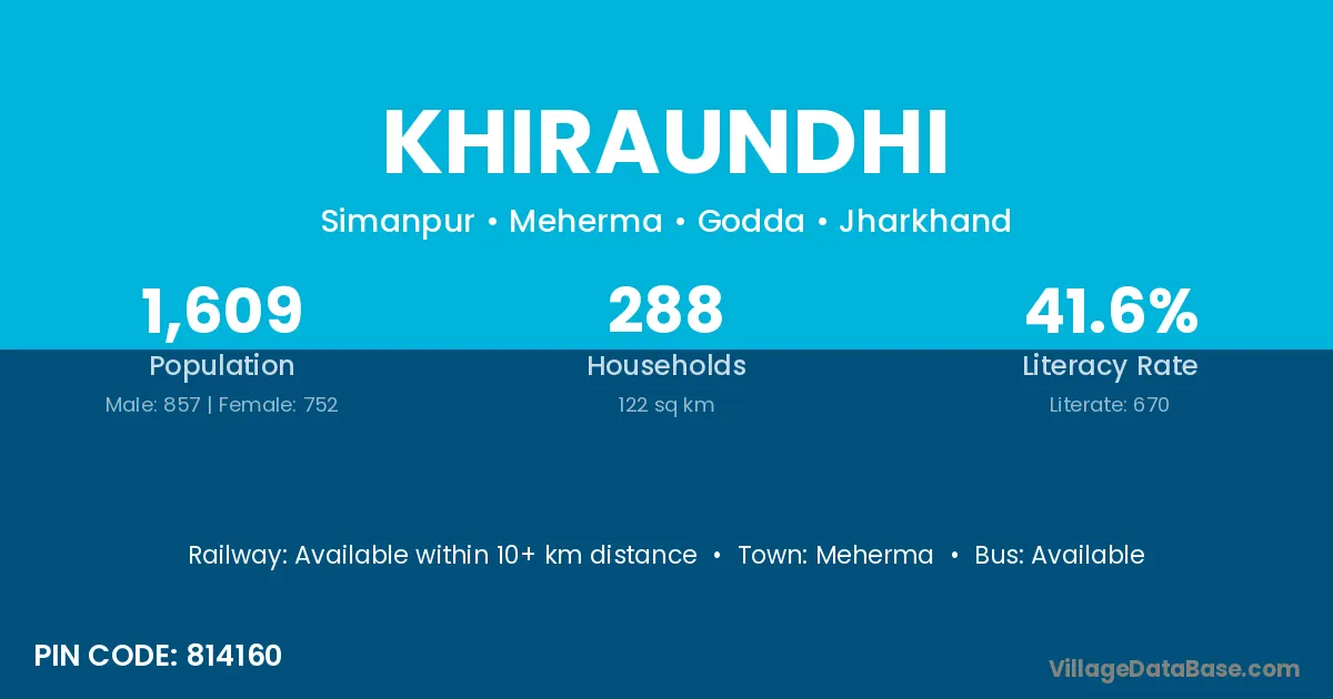 Khiraundhi village has a total population of 1,609 people, of which 857 are males and 752 are females.