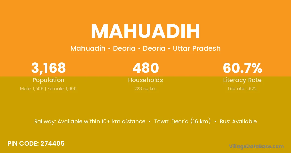 The literacy rate of Mahuadih village is 42.65%. Male literacy stands at 51.34% and female literacy at 32.78%.
