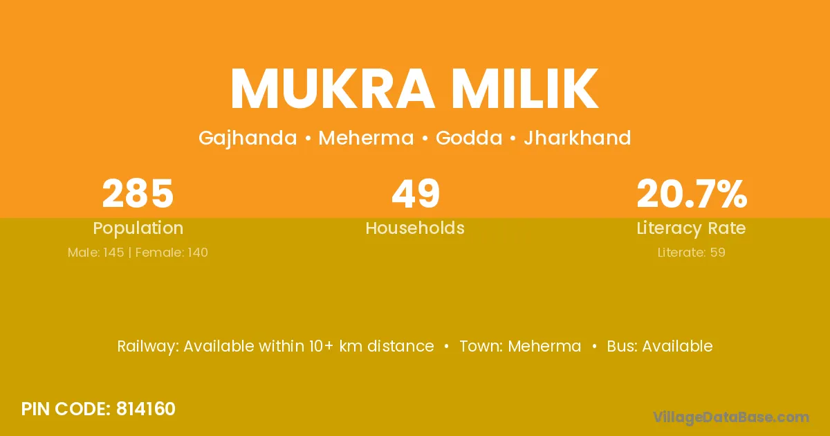 Meherma is the nearest town to Mukra Milik village for major economic activities