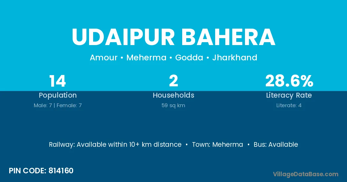 Udaipur Bahera village has a total population of 14 people, of which 7 are males and 7 are females.