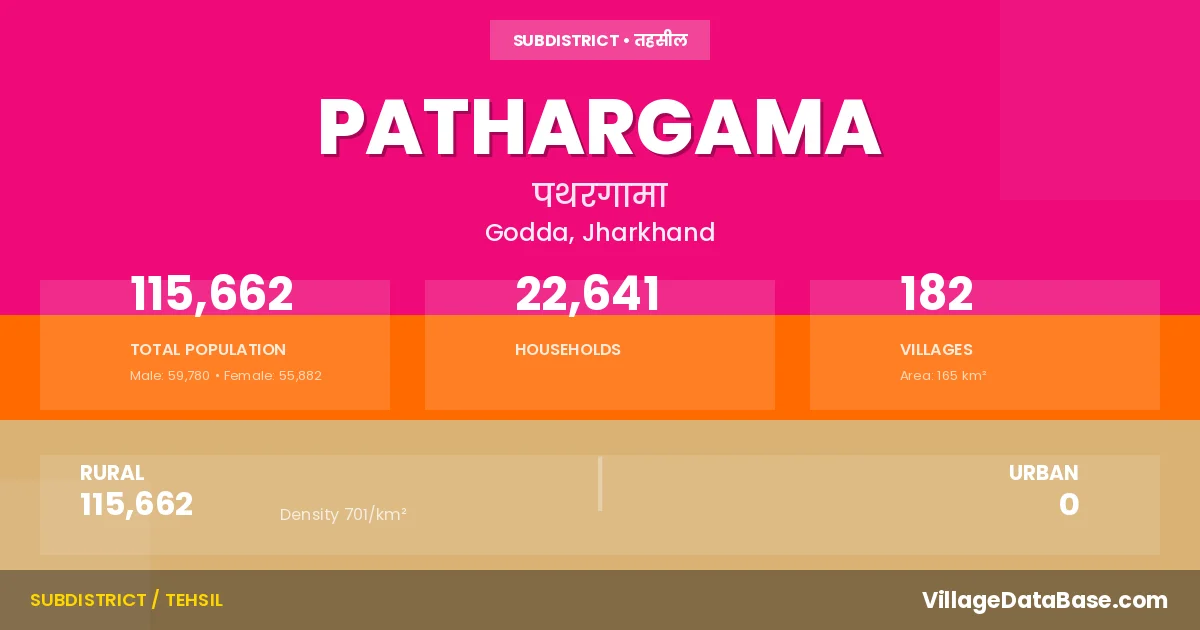 Pathargama is a town and Subdivision in the Godda district of the Jharkhand. In India, a Subdivision is a subdivision of a district responsible for the administration and revenue collection of a specific area within the district. Subdivisions play a crucial role in the local governance structure, contributing significantly to the development and administration of their communities.