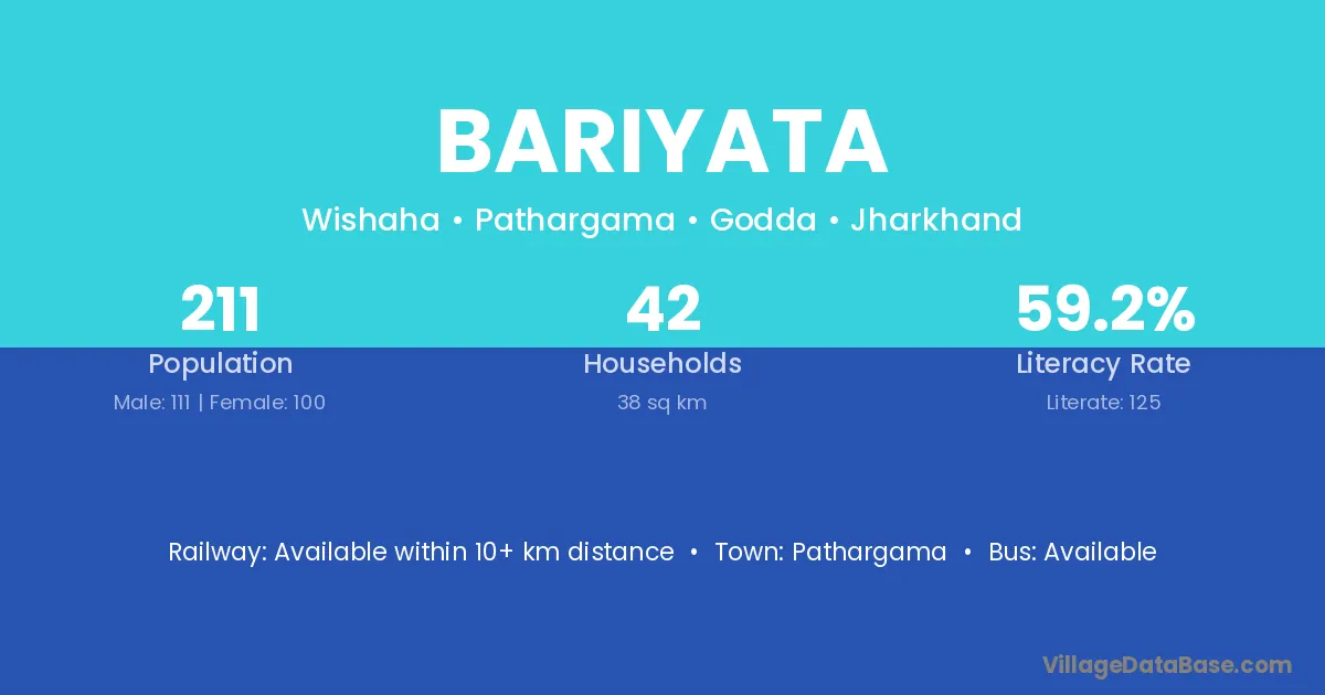 Bariyata village has a total population of 211 people, of which 111 are males and 100 are females.