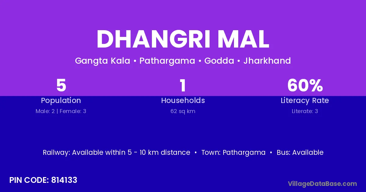 Dhangri Mal village has a total population of 5 people, of which 2 are males and 3 are females.