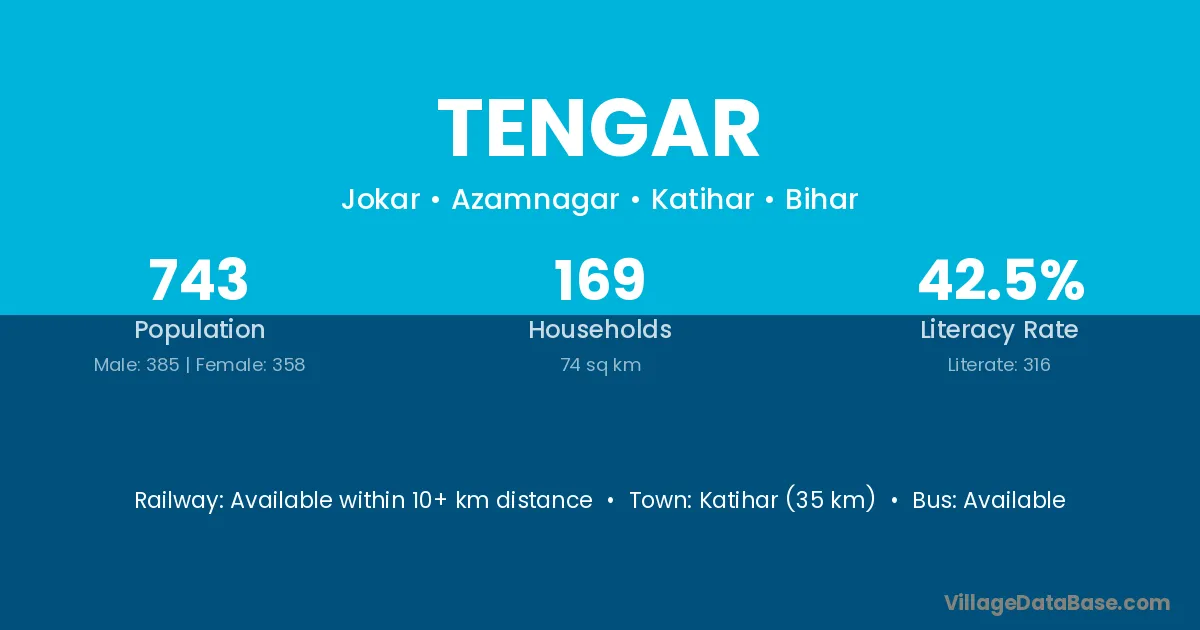 The literacy rate of Tengar village is 52.57%. Male literacy stands at 66.88% and female literacy at 35.55%.