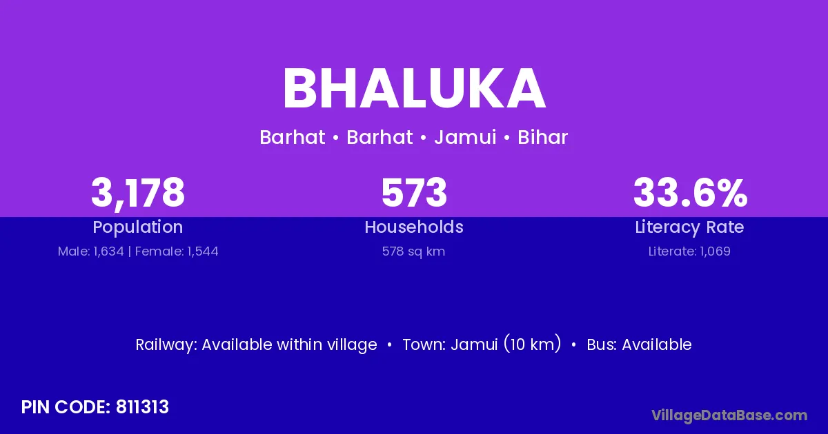 The literacy rate of Bhaluka village is 47.37%. Male literacy stands at 66.13% and female literacy at 29.81%.