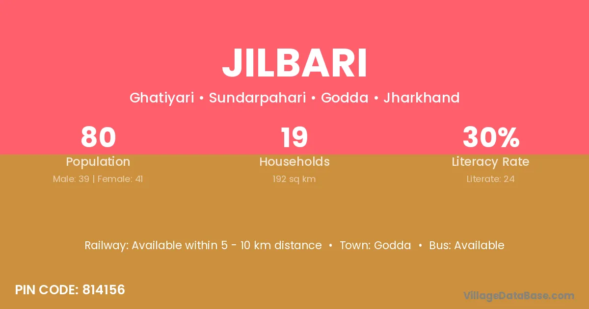 Jilbari village has a total population of 80 people, of which 39 are males and 41 are females.