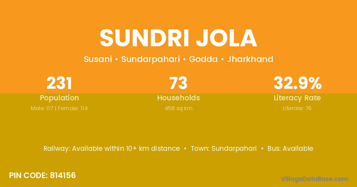 Sundri Jola village has a total population of 231 people, of which 117 are males and 114 are females.
