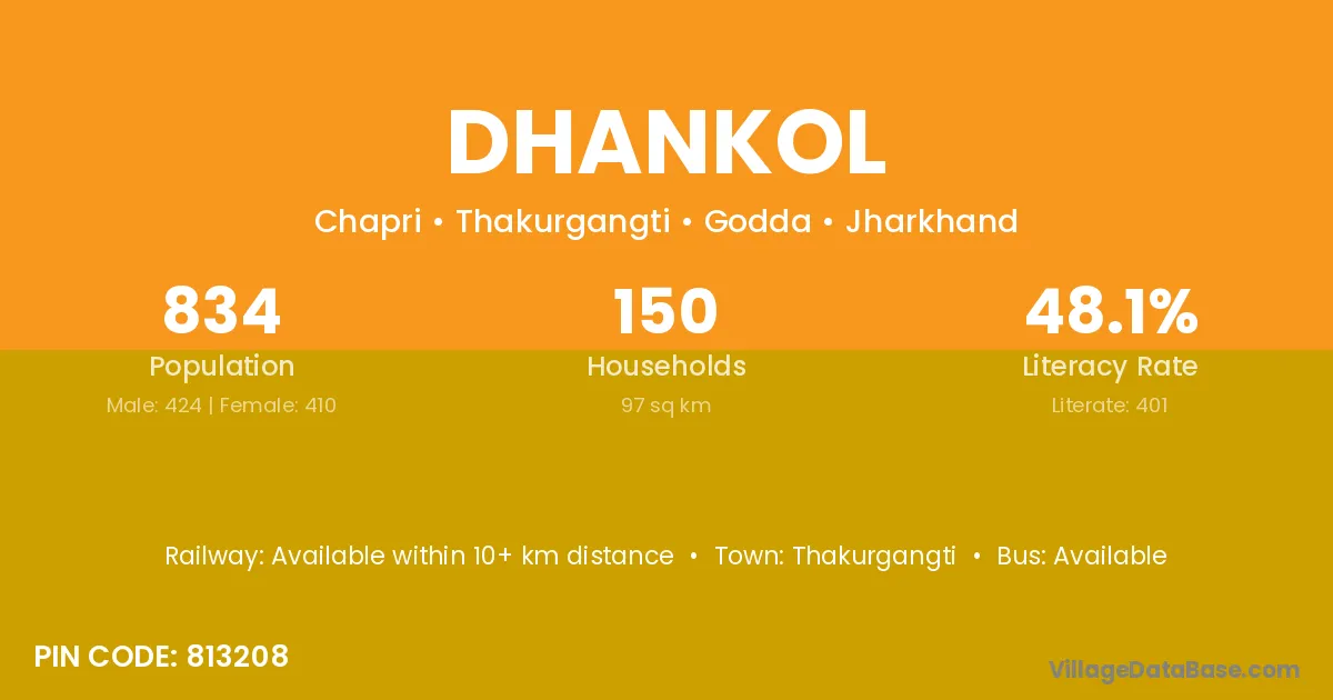 Dhankol village has a total population of 834 people, of which 424 are males and 410 are females.