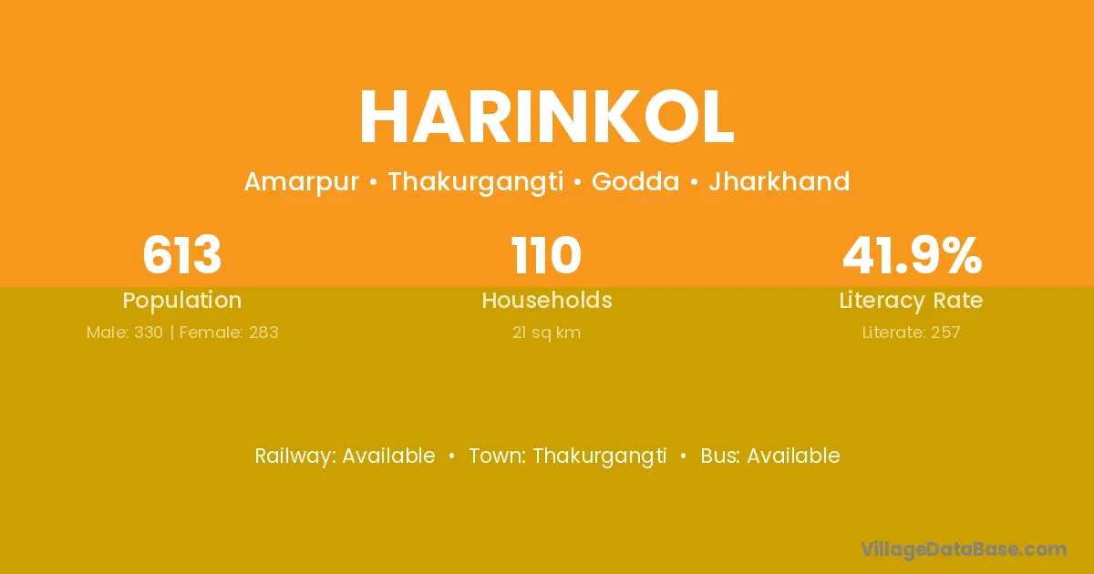 Harinkol village has a total population of 613 people, of which 330 are males and 283 are females.