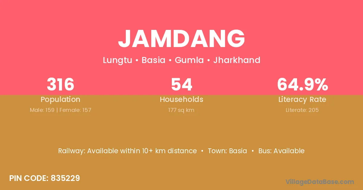 Jamdang village has a total population of 316 people, of which 159 are males and 157 are females.