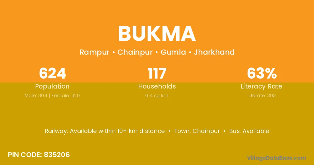 Bukma village has a total population of 624 people, of which 304 are males and 320 are females.
