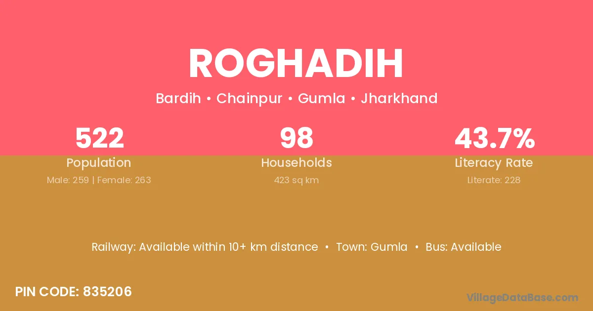 The literacy rate of Roghadih village is 43.68%. Male literacy stands at 61.78% and female literacy at 25.86%.
