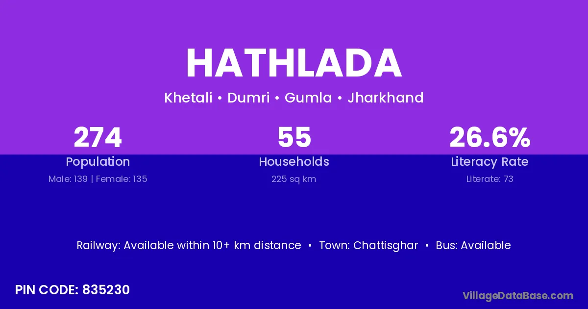 Hathlada village has a total population of 274 people, of which 139 are males and 135 are females.