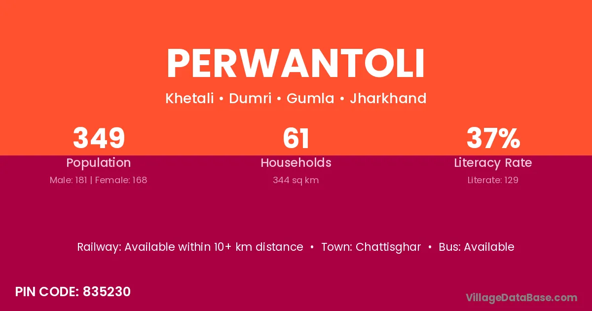 The literacy rate of Perwantoli village is 36.96%. Male literacy stands at 41.99% and female literacy at 31.55%.