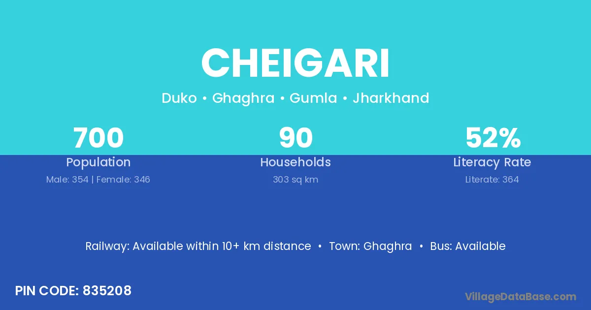 Cheigari village has a total population of 700 people, of which 354 are males and 346 are females.