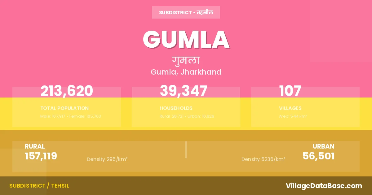 According to the 2011 census The total area of Gumla Subdivision is 544 km², with a population of 213620 people. The population density is 393 inhabitants per square kilometre, and there are approximately 39347 houses in the sub district.