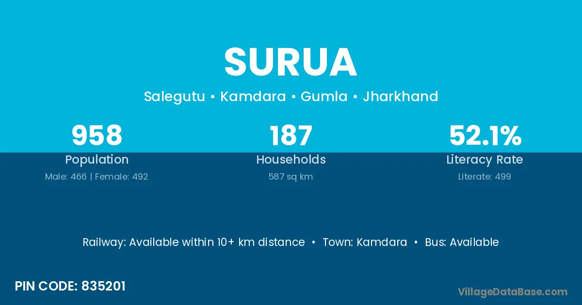Surua village has a total population of 958 people, of which 466 are males and 492 are females.