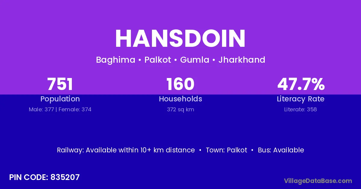 Hansdoin village has a total population of 751 people, of which 377 are males and 374 are females.