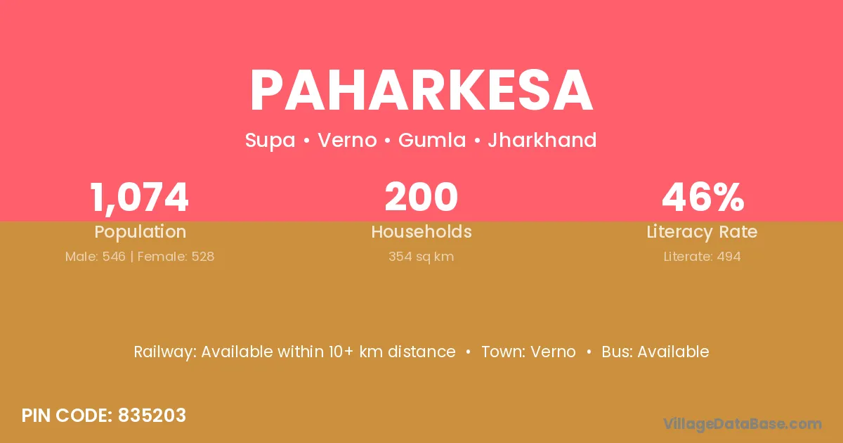 Paharkesa village has a total population of 1,074 people, of which 546 are males and 528 are females.