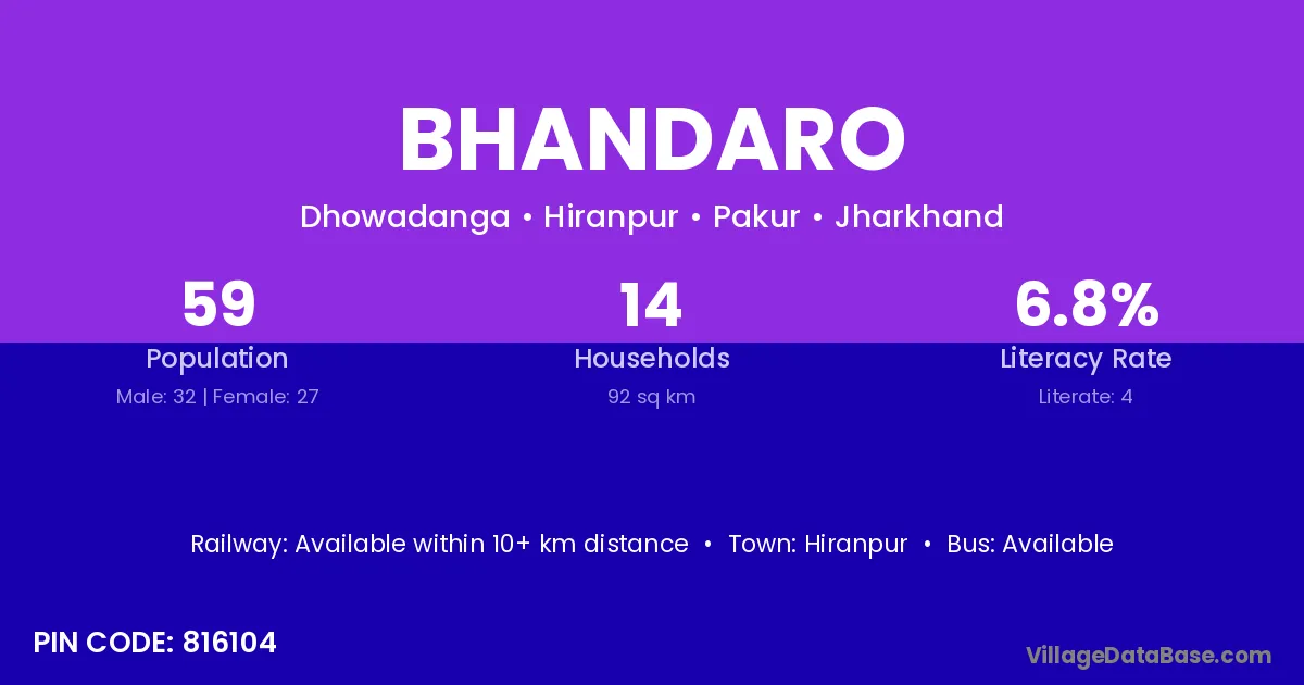 The literacy rate of Bhandaro village is 50.13%. Male literacy stands at 60.89% and female literacy at 38.43%.