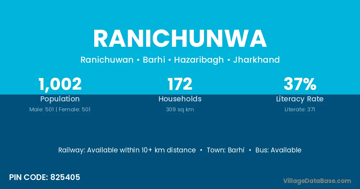Ranichunwa village has a total population of 1,002 people, of which 501 are males and 501 are females.