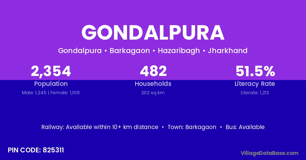 Gondalpura village has a total population of 2,354 people, of which 1,245 are males and 1,109 are females.