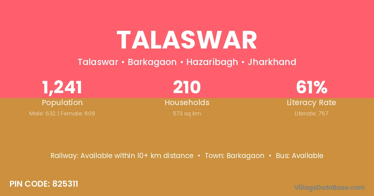 Talaswar village has a total population of 1,241 people, of which 632 are males and 609 are females.