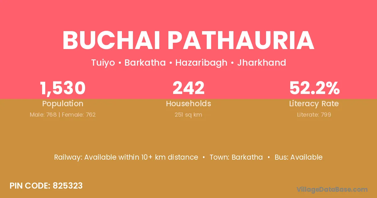 Buchai Pathauria village has a total population of 1,530 people, of which 768 are males and 762 are females.