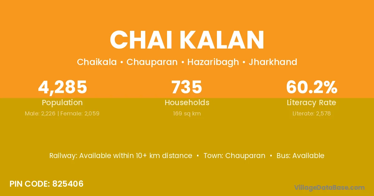 Chai Kalan village has a total population of 4,285 people, of which 2,226 are males and 2,059 are females.
