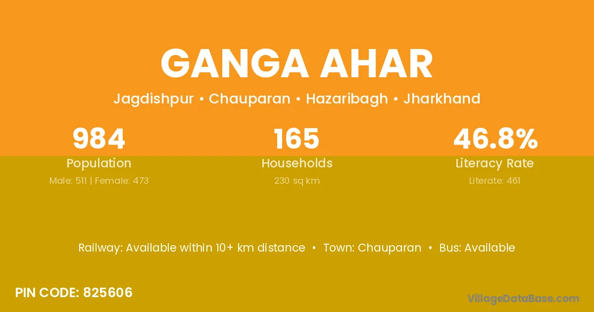 Ganga Ahar village has a total population of 984 people, of which 511 are males and 473 are females.