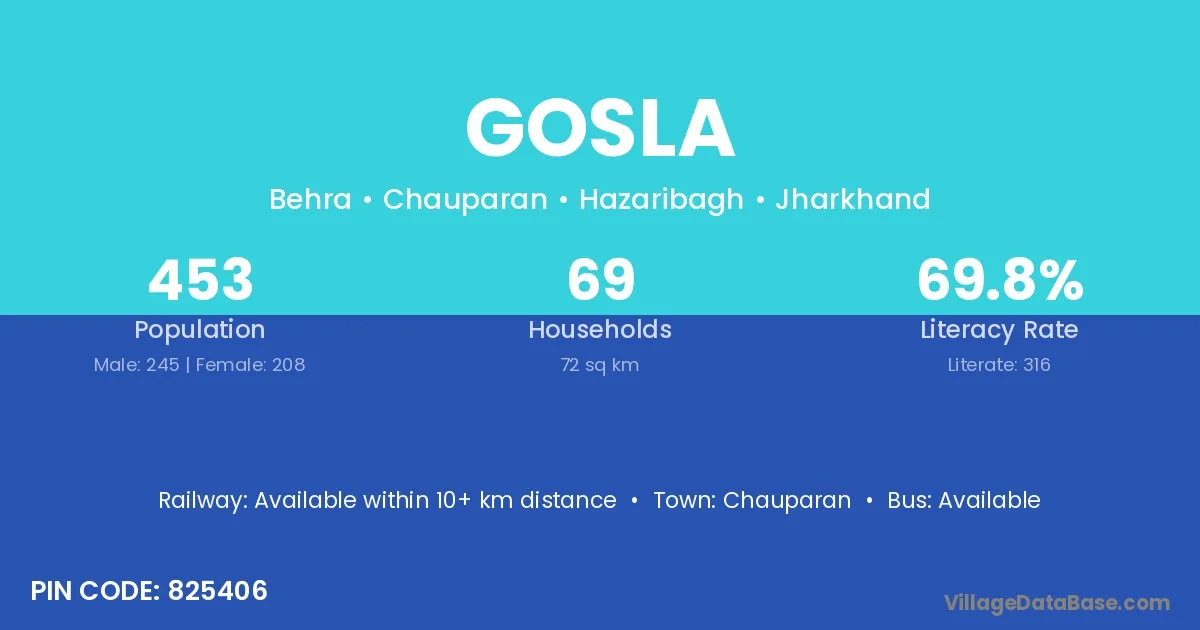 Gosla village has a total population of 453 people, of which 245 are males and 208 are females.