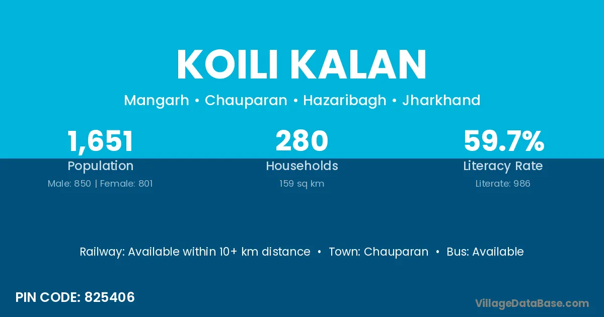 Koili Kalan village has a total population of 1,651 people, of which 850 are males and 801 are females.