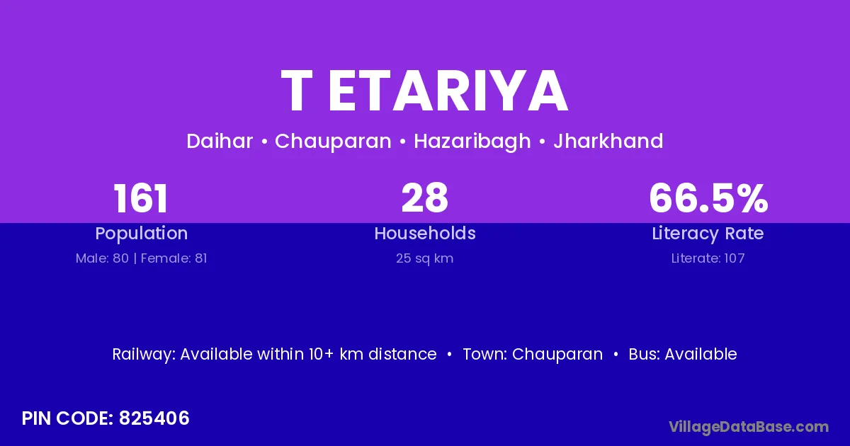 T Etariya village has a total population of 161 people, of which 80 are males and 81 are females.