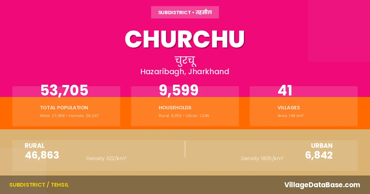 Churchu is a town and Subdivision in the Hazaribagh district of the Jharkhand. In India, a Subdivision is a subdivision of a district responsible for the administration and revenue collection of a specific area within the district. Subdivisions play a crucial role in the local governance structure, contributing significantly to the development and administration of their communities.