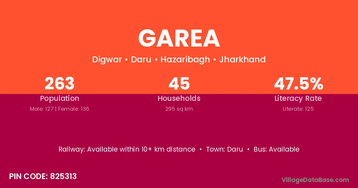 Garea village has a total population of 263 people, of which 127 are males and 136 are females.